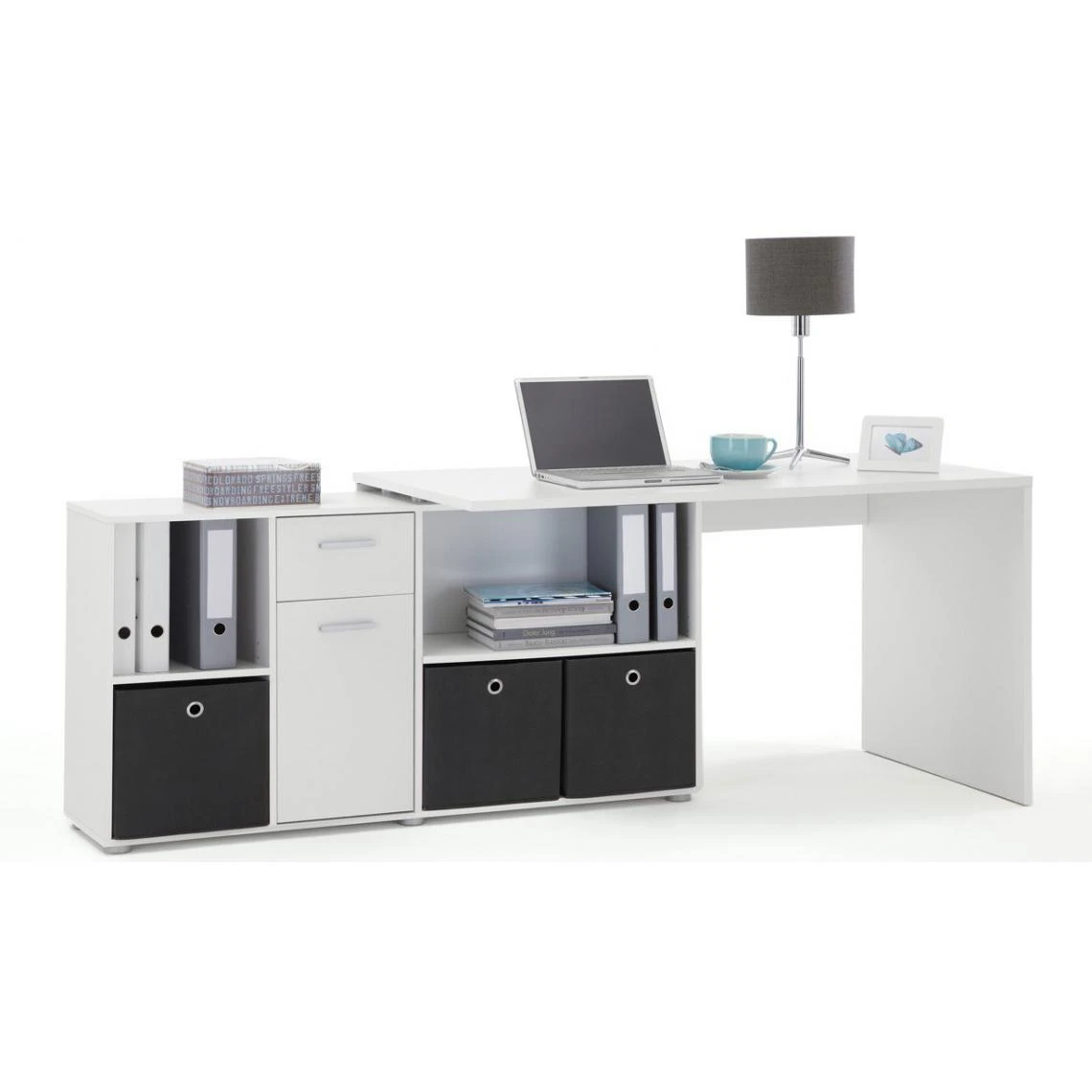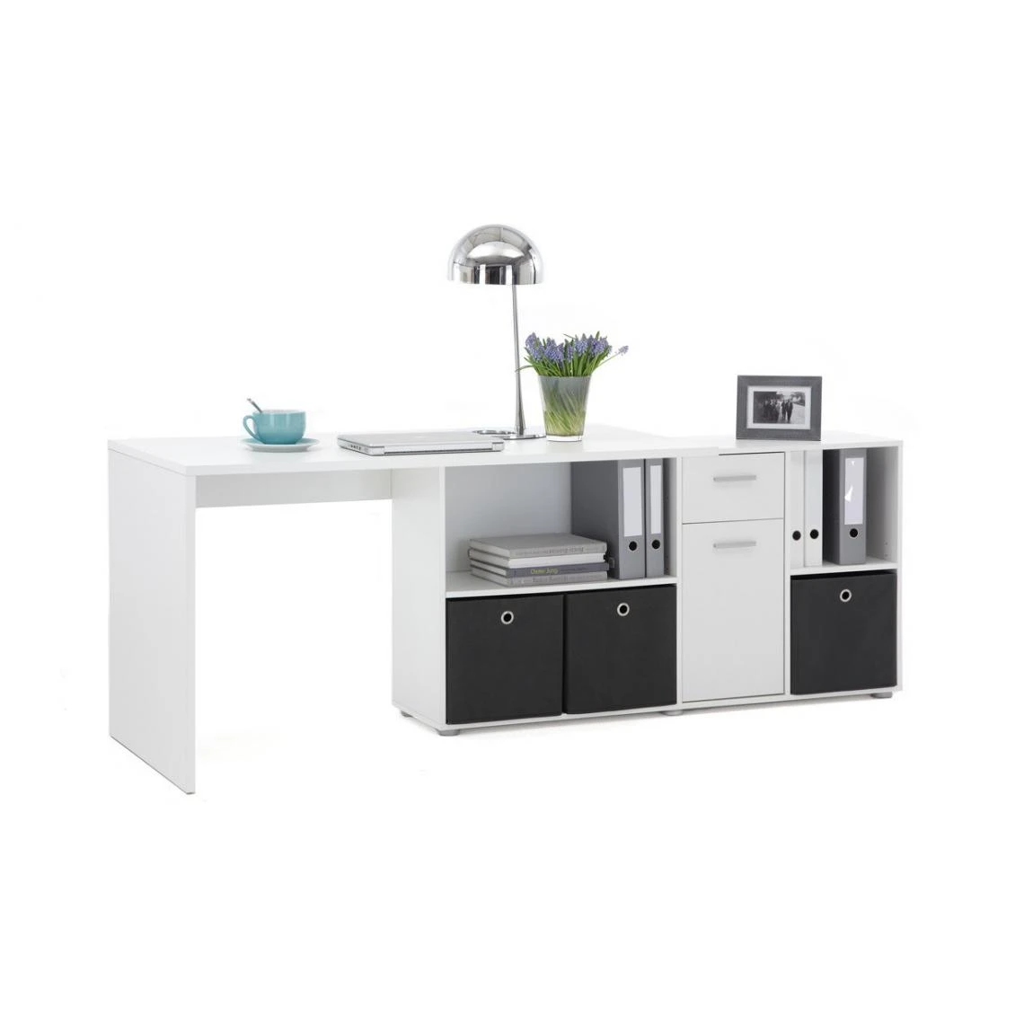 Bureau d’angle rĂ©versible avec 4 compartiments ouverts, une porte et un tiroir pour un rangement optimal.