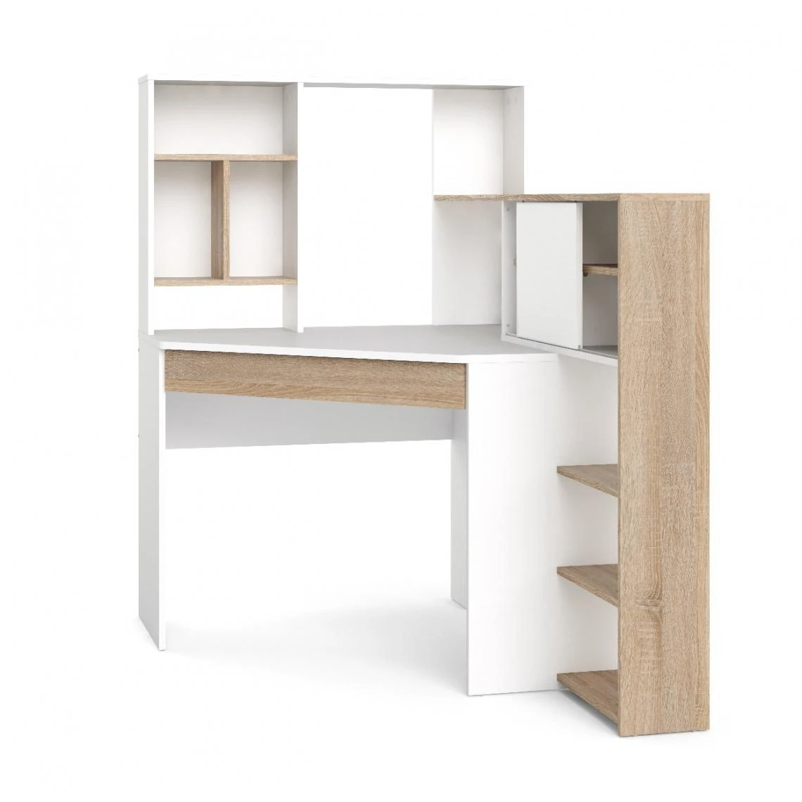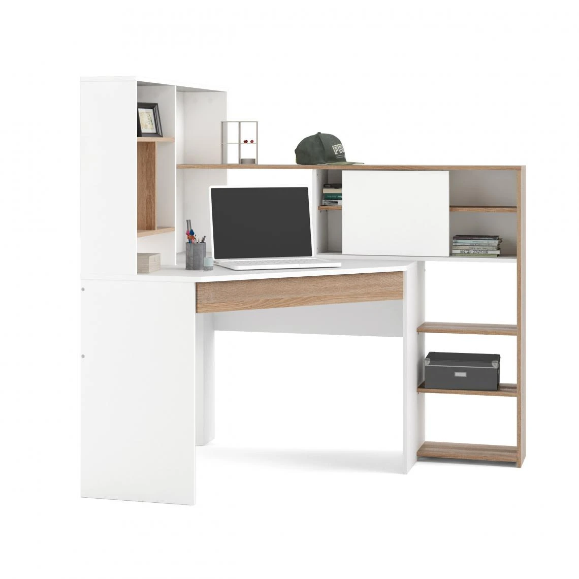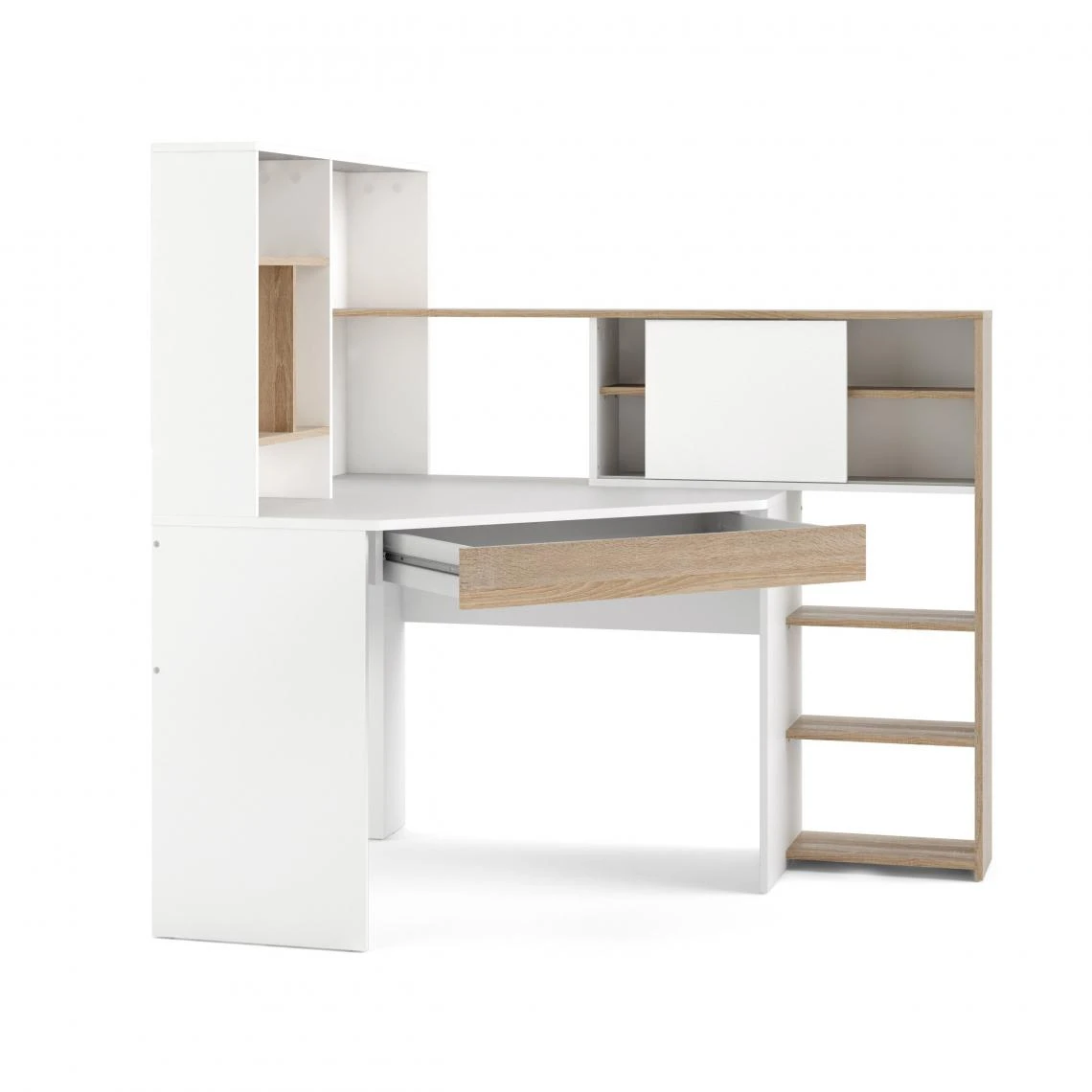 Points forts Alter Bureau d’angle avec bibliothèque, coloris blanc et chêne, 138 x 141 x 101 cm