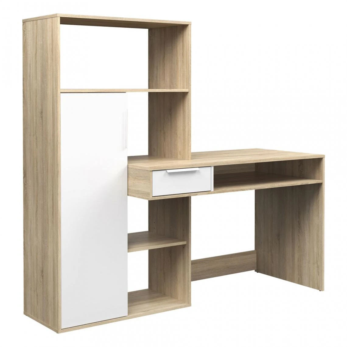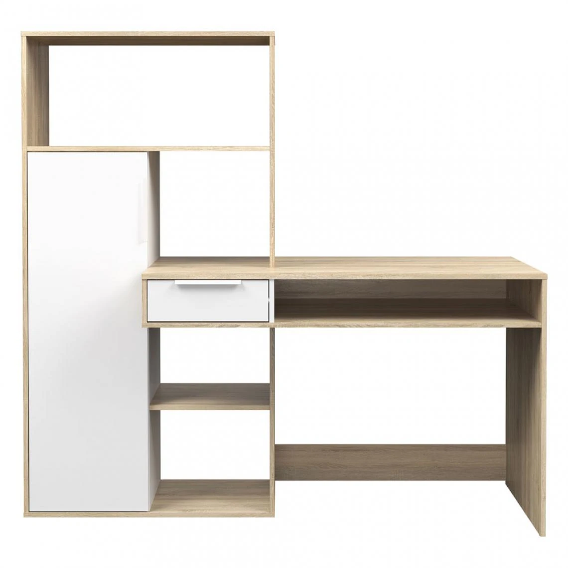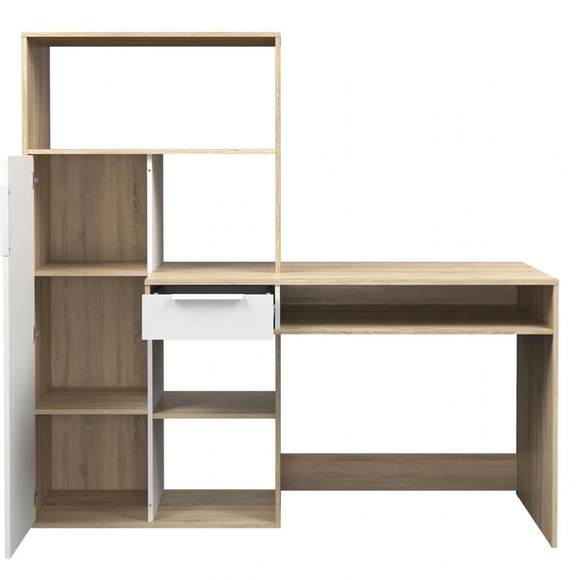 Bureau multifonctionnel en blanc et chêne, avec étagères et portes ouvertes. Solution idéale pour un bureau à domicile, il vous permet d’avoir toujours à portée de main les objets dont vous avez besoin et de les ranger de manière ordonnée. Ses lignes sont essentielles et confèrent au produit un design moderne. Entièrement réalisé en panneaux de particules mélaminés, il résiste aux chocs et aux rayures et est facile à nettoyer. Dimensions en cm : cm163x60h155