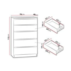 La commode Celia offre une grande capacité de rangement grâce à ses 5 tiroirs coulissants facilement accessibles.