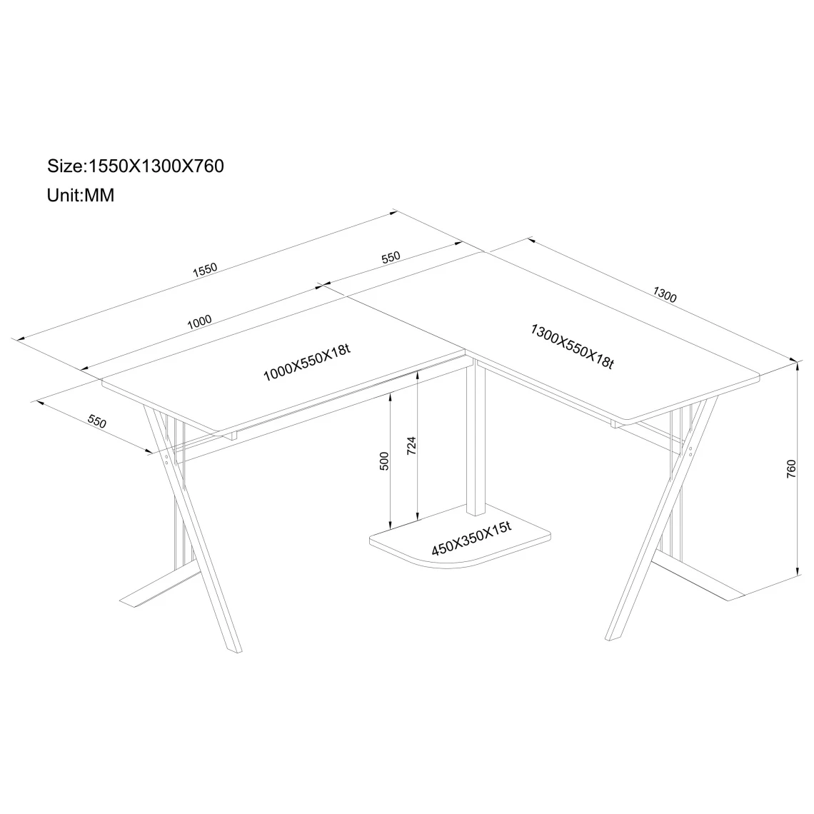 - Grande surface de travail : Longueur 1=155 cm – Longueur 2= 130 cm, Largeur=55 cm (Voir la notice technique dĂ©taillĂ©e)