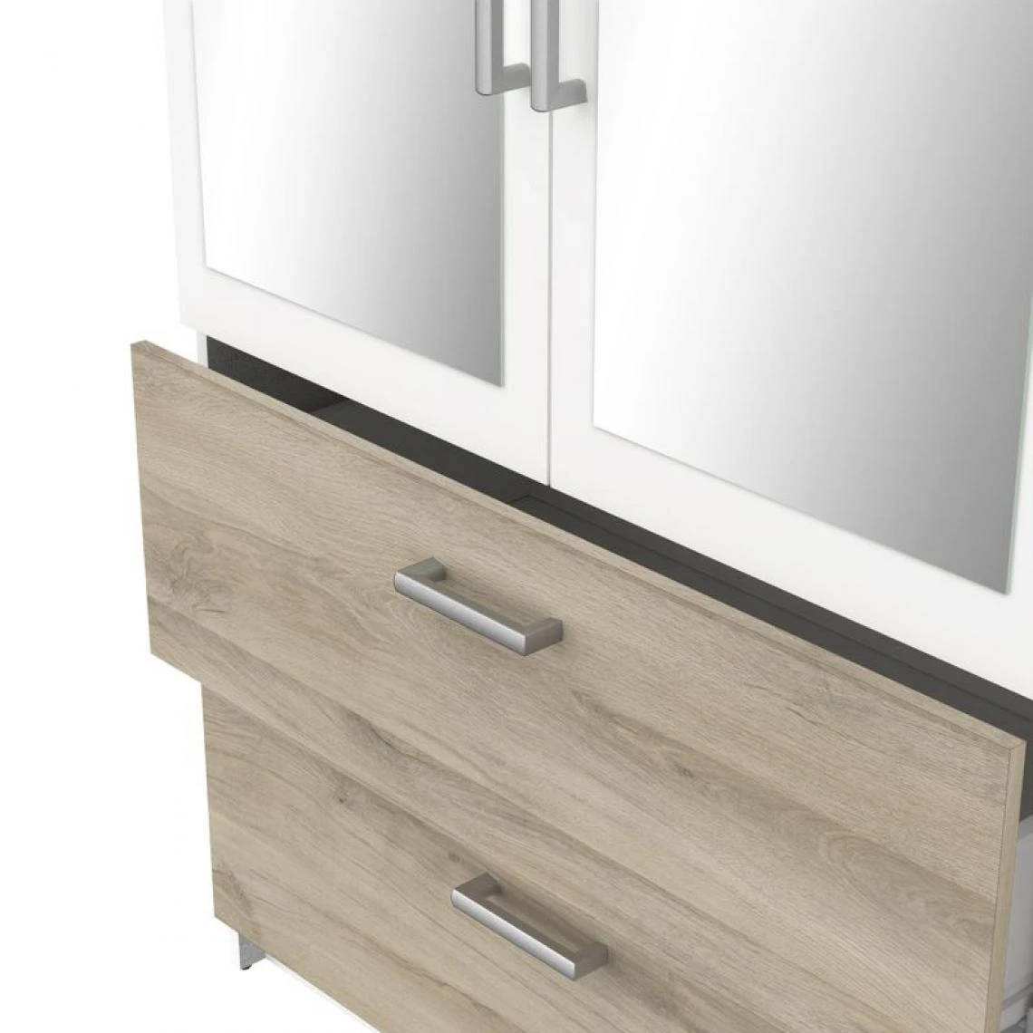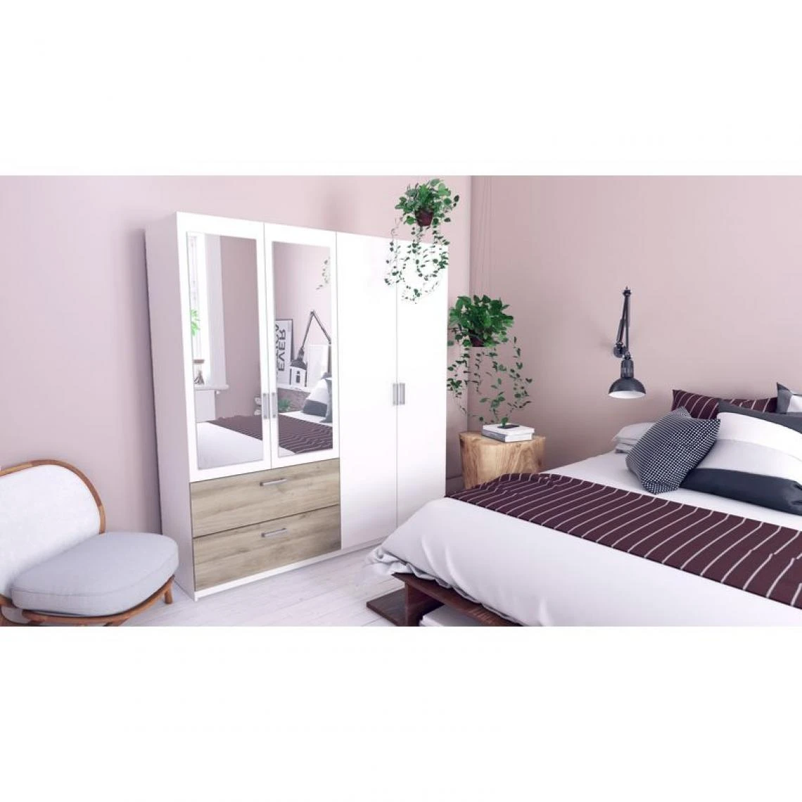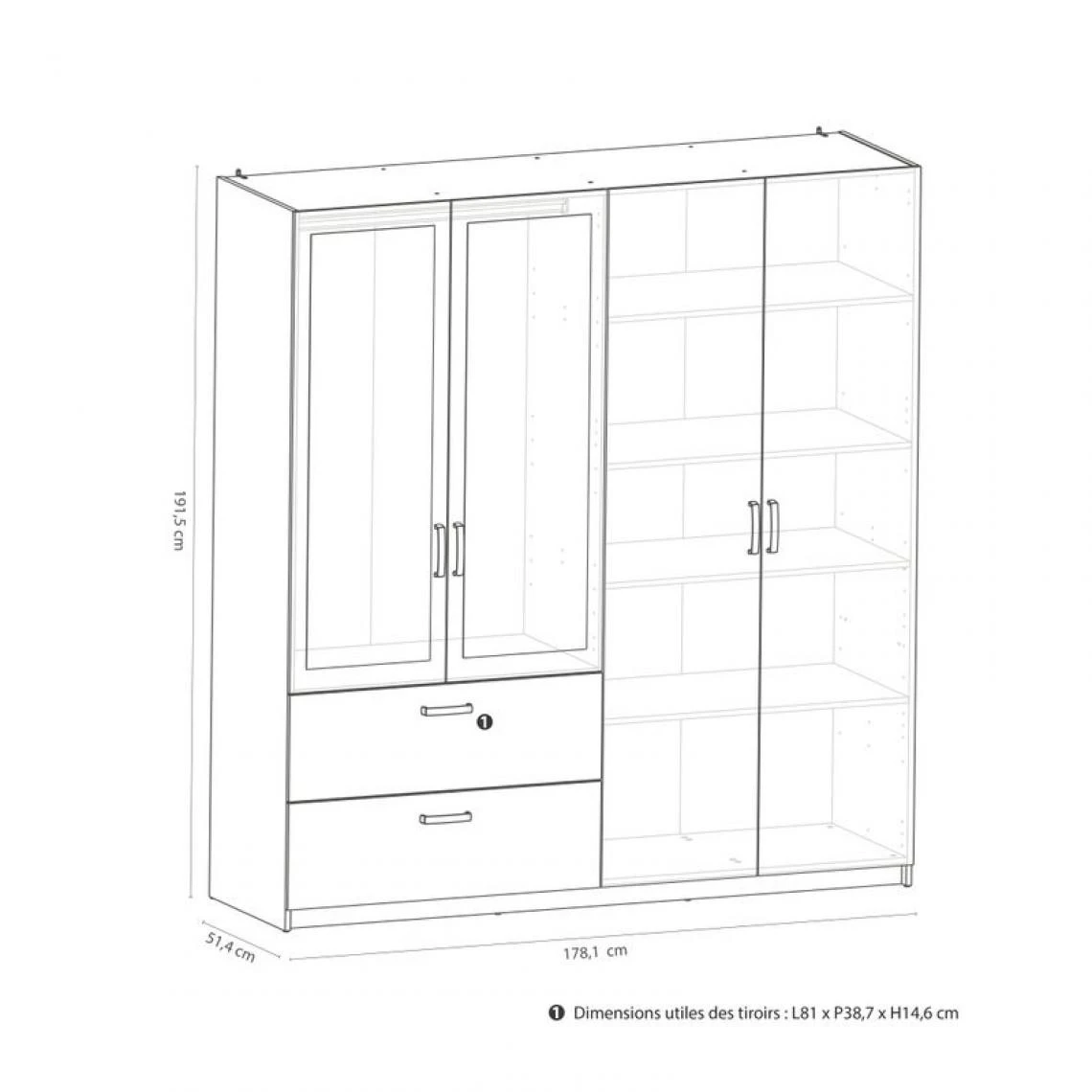Teinte :imitation chĂȘne kronberg et blanc. . Comprend :4 portes battantes dont 2 avec miroir, 1 penderie, 2 tiroirs et 4 rayons rĂ©glables. . Garantie :2 ans , PiĂšces. . Structure :panneaux de particules revĂȘtus de papier dĂ©cor imitation chĂȘne kronberg et blanc. IntĂ©rieur dĂ©cor imitation lin tissĂ©. . A monter soi-mĂȘme. . Dimensions en cm :L. 178,1 – H. 191,5 – P. 51,4 cm. . Façade tiroir (s) :dĂ©cor imitation chĂȘne kronberg. . Dispo pcs dĂ©tachĂ©es donnĂ©e fournisseur :NC. .