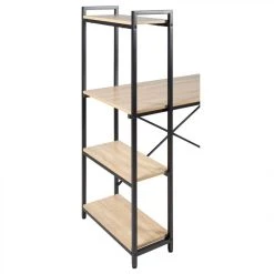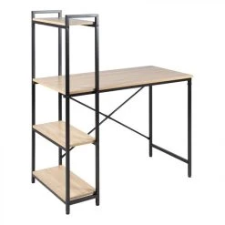 Finition :papier imitation chêne. . Garantie :2 ans. . Plateau :panneaux de particules. . Tablette :panneaux de particules. . Structure :acier époxy noir. . Piètement :acier époxy noir. . A monter soi-même. . Dimensions en cm :L. 109 – H. 75/124 – P. 54. . Charge maxi autorisée :bureau : 80 et étagères : 10 kg. . Dispo pcs détachées donnée fournisseur :NC. .