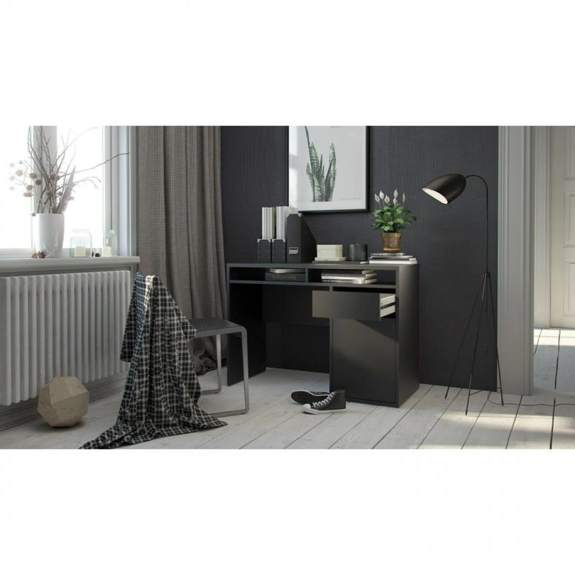 Un bureau compact aux finitions noir laquĂ© s’accordant avec la sĂ©rie BEST de rangement et chambre.. Existe en imitation chĂŞne, imitation chĂŞn gris, blanc laquĂ© et imitation bĂ©ton/blanc..