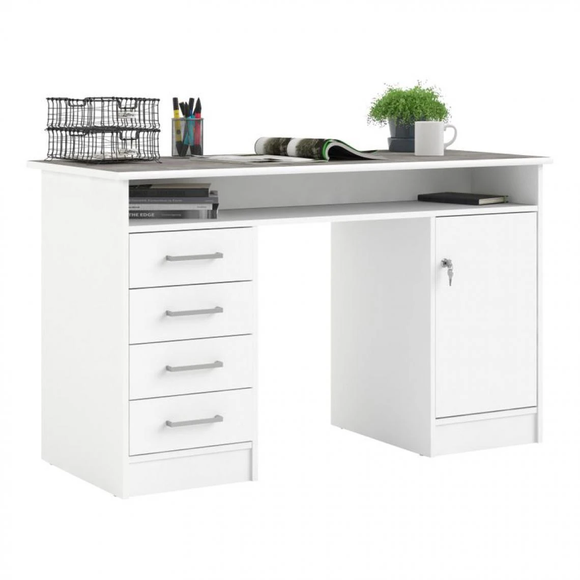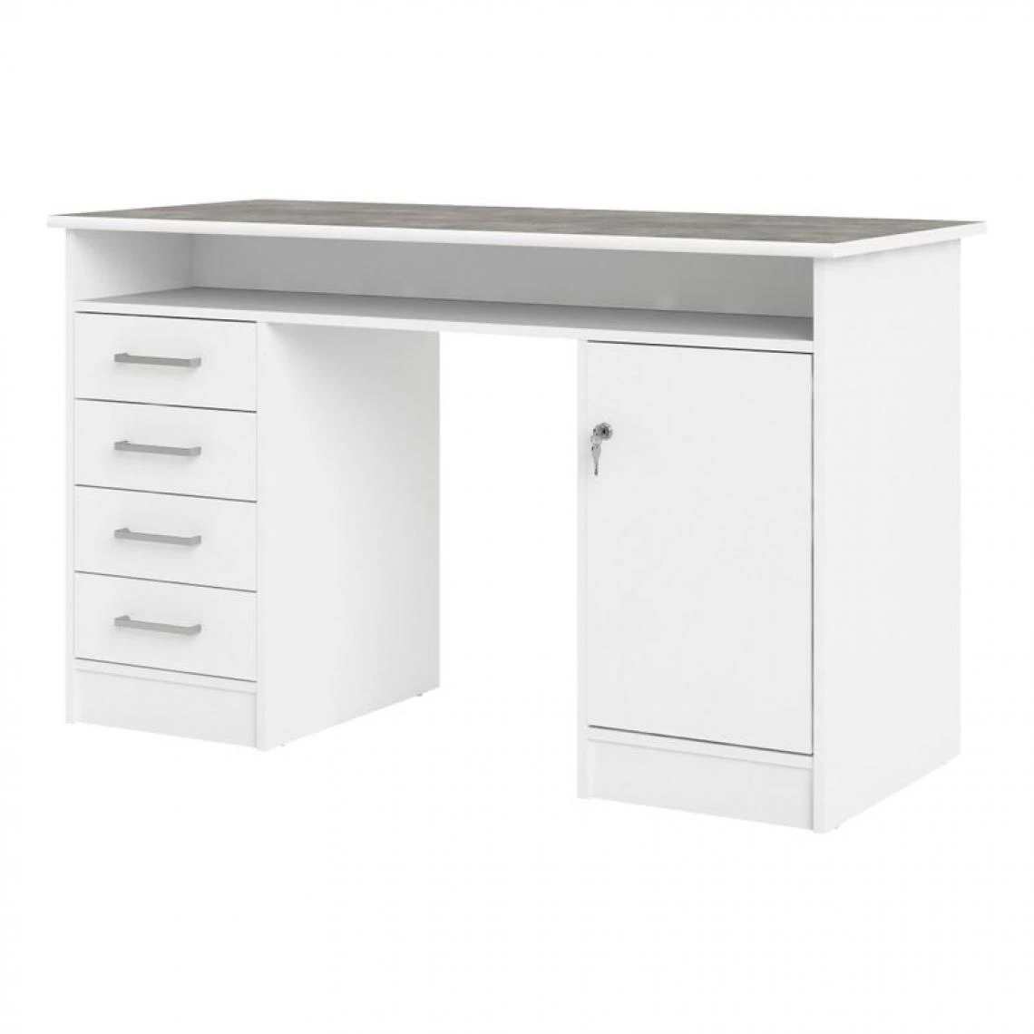 Porte :1 avec serrure. . Tiroirs :4. . Finition :papier dĂ©cor blanc et imitation bĂ©ton. . Garantie :2 ans , Pièces. . Plateau :18 mm, softĂ©. . Tablette :1 intĂ©rieure. . Structure :panneaux de particules. . A monter soi-mĂŞme. . Dimensions en cm :L. 126 – H. 75,6 – P. 55 cm. . Dispo pcs dĂ©tachĂ©es donnĂ©e fournisseur :NC. .