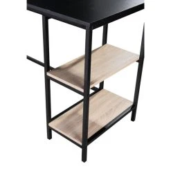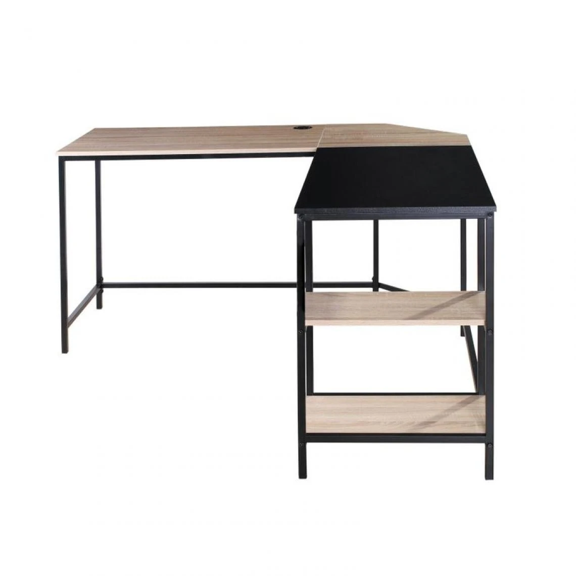 Structure :Structure en panneaux de fibres de densité moyenne mélaminés . Facade :Angle réversible (montage à gauche ou à droite) . Plateau :Deux panneaux rectangulaires de dimension : 88 x 50 cm . Dessus :Avec port USB 2.0, alimenté par cable USB 2.0 double ports. . Tablette :2 étagères de dimensions : L.49 x P.24 x H.28 cm. . Pietement :Supports et piétement en acier recouvert d’époxy . Finition :Epoxy noir. Mélamine noire et imitation chêne . Charge maxi autorisee :Poids max supporté par le plateau 80 kg . Dimensions en cm : L.138,5 x l.138,5 x H.75,5 cm . Dispo pcs detachees donnee fournisseur :0 an . Garantie :2 ans . A monter soi-memeOui .