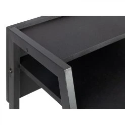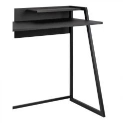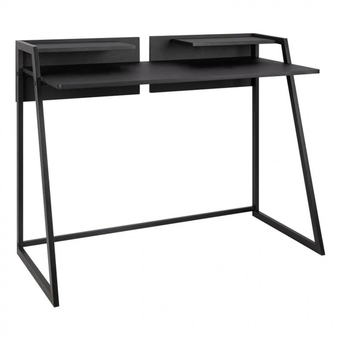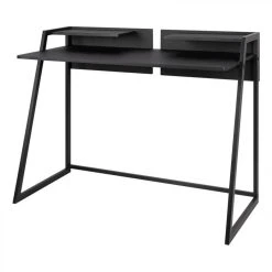 Un bureau avec des rangements pratiquesAussi pratique qu’Ă©lĂ©gant, le bureau ONYX dispose de 2 tablettes intĂ©grĂ©es qui vous permettront de conserver une partie de votre bibliothèque ou des dossiers Ă portĂ©e de main. Le piètement Ă©purĂ© en mĂ©tal lui apporte une jolie touche moderne, inspirĂ©e de la tendance industrielle. Ce bureau de L. 114 – H. 75/86 – P. 53 cm est particulièrement fonctionnel. Ses tablettes et son plateau sont en panneaux de fibres de moyenne densitĂ©, recouverts de PVC, un matĂ©riau robuste et lĂ©ger, qui se nettoie d’un simple coup d’Ă©ponge. Ce bureau design doit ĂŞtre montĂ© par vos soins, mais l’assemblage est facile et rapide.Chic et Ă©purĂ©Avec son design minimaliste, ce bureau noir se fond parfaitement dans un intĂ©rieur contemporain ou d’inspiration industrielle. Il trouvera facilement sa place dans une pièce dĂ©diĂ©e ou dans un recoin de votre salon. Ce bureau droit avec casiers s’assortit aisĂ©ment avec des Ă©tagères en bois du mĂŞme coloris.