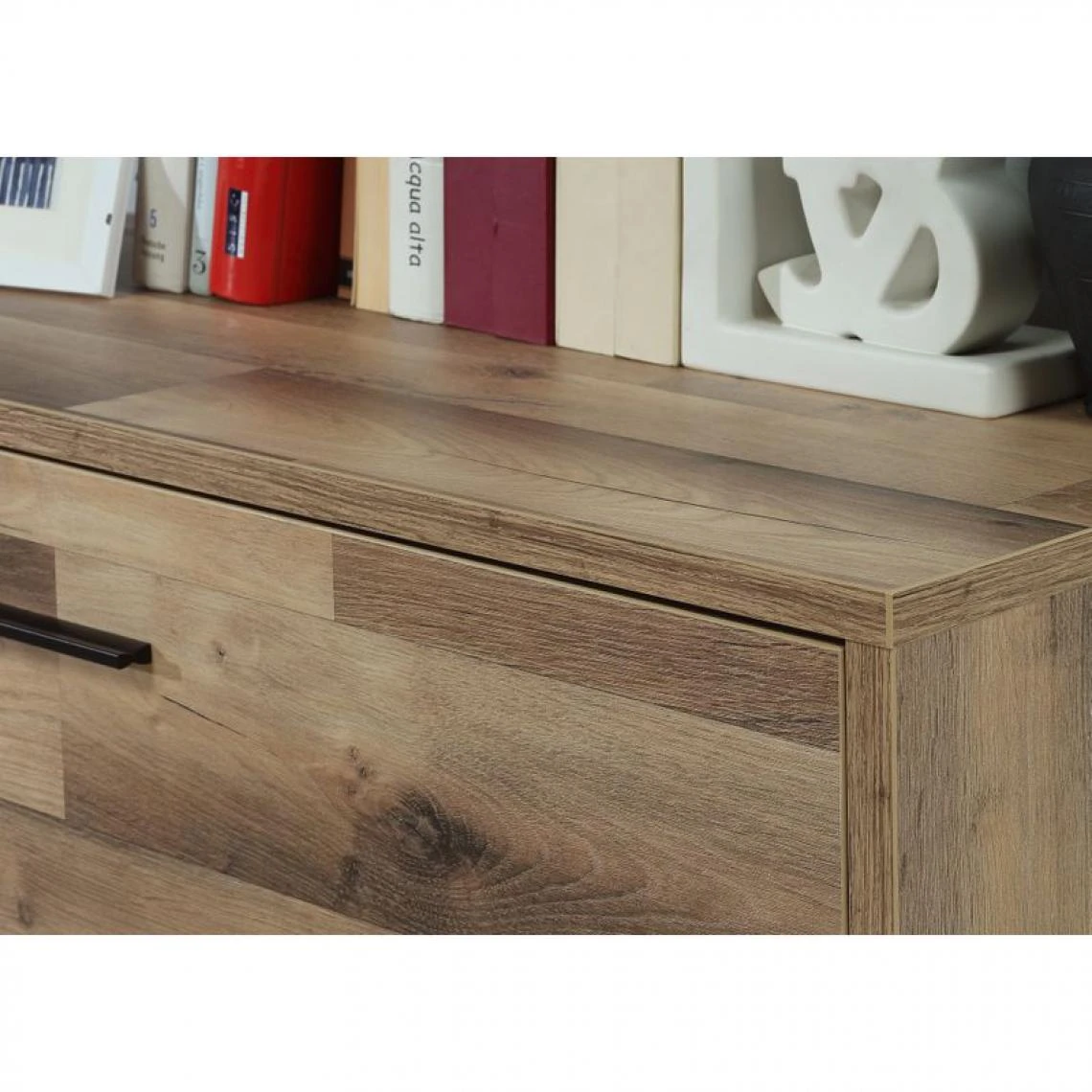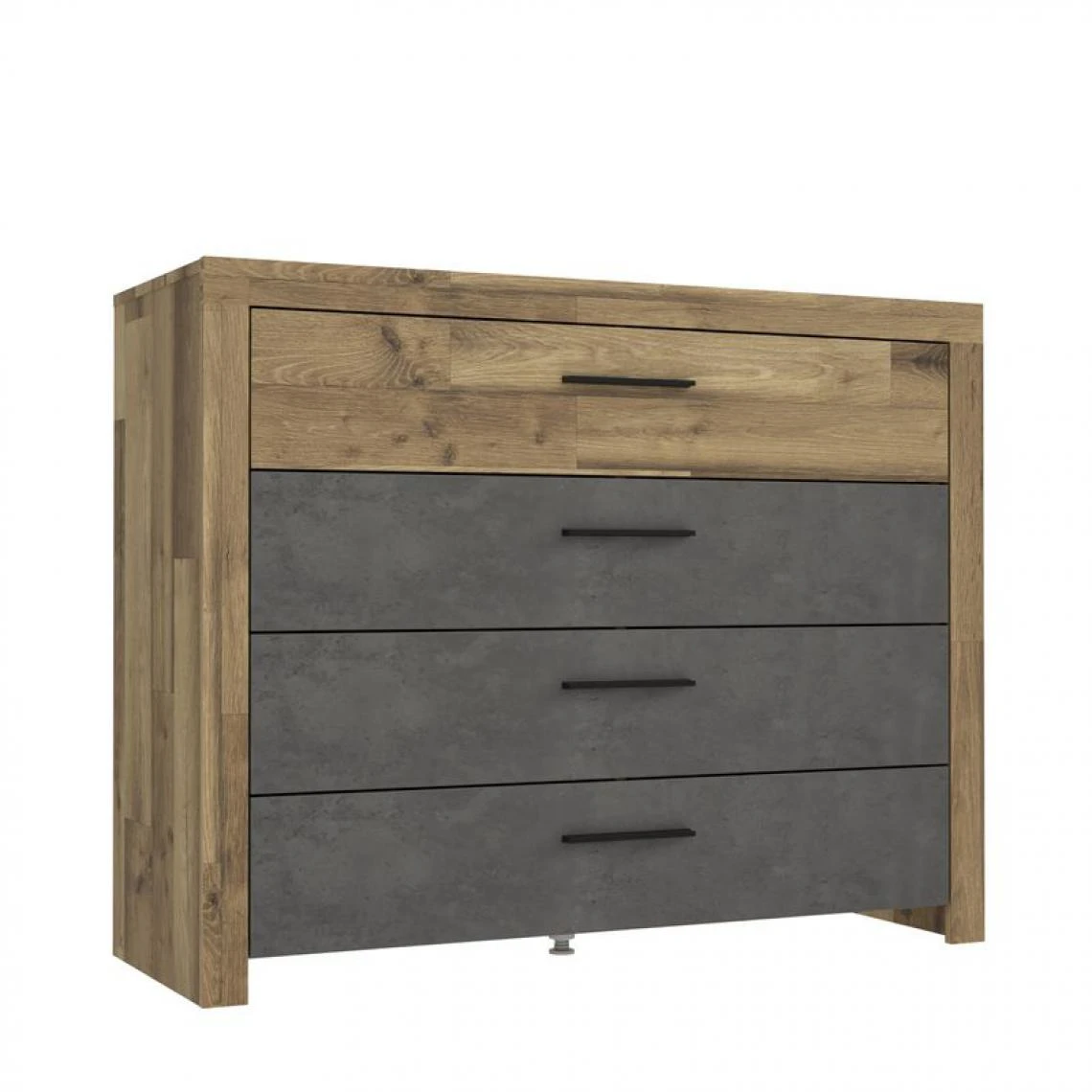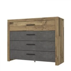 On ne se lasse pas de l’allure industrielle de la commode RICCIANO. Son design sophistiqué se distingue par un revêtement en papier décor imitation chêne et béton gris souligné par des poignées en acier noir. Solide, cette commode avec 4 doubles tiroirs bénéficie d’une structure en panneaux de particules et panneaux de fibres de moyenne densité.