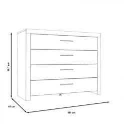 Ordonner le linge plié dans une chambre, optimiser le tri de vos affaires dans une entrée, ou combler un espace dans une pièce à vivre avec des rangements supplémentaires : les quatre doubles tiroirs de cette commode imitation chêne et béton grise offrent des solutions de rangement optimales. Dotée d’un large plateau, cette commode de dimensions L. 111 x H. 88,1 x P. 41 cm saura mettre en valeur des objets de décoration ou une plante. Rapide à monter soi-même, cette commode est également facile à nettoyer : un simple chiffon en microfibre suffit à l’entretenir.