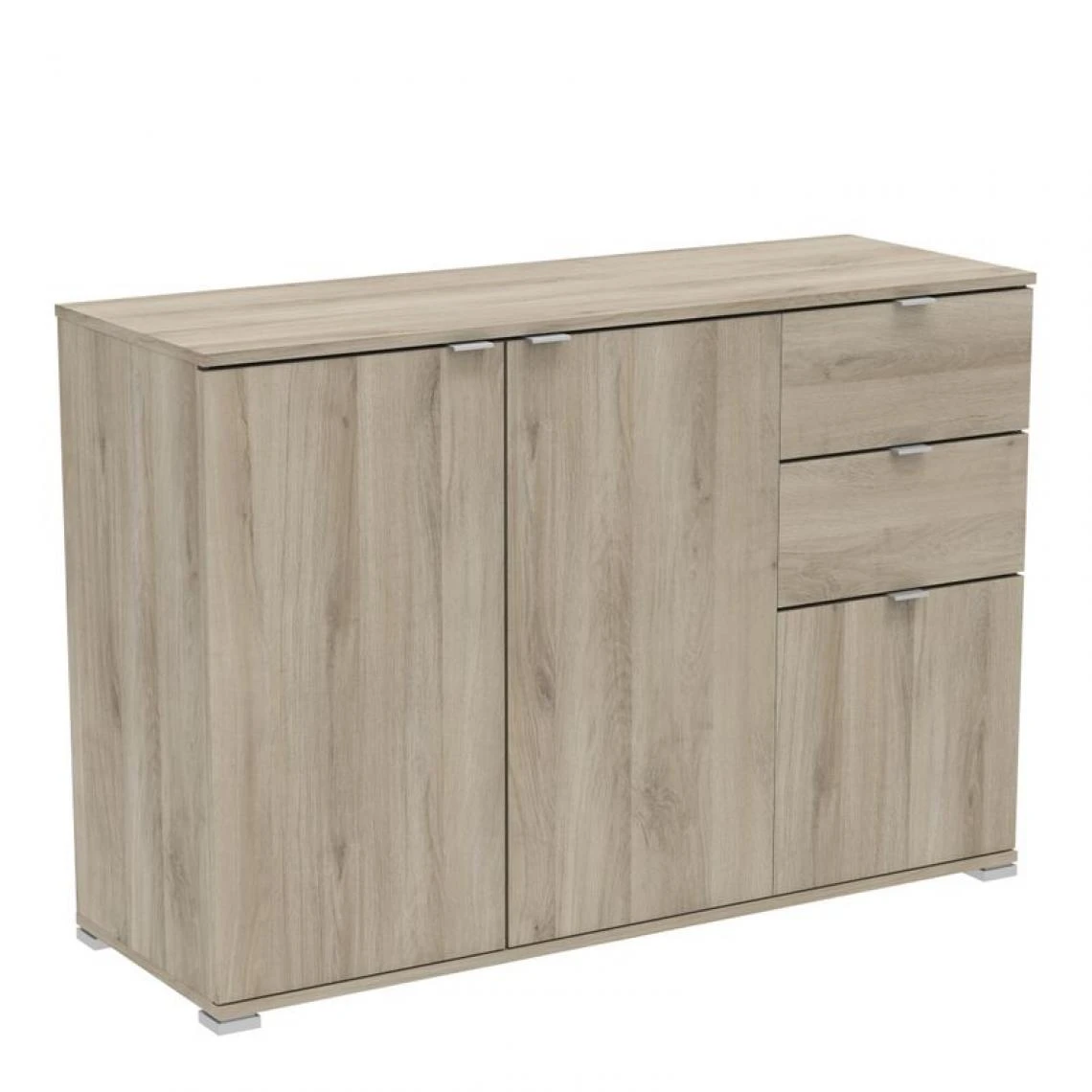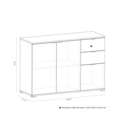 Le rangement PERFECT est un meuble bas muni de 3 portes et 2 tiroirs. Les grandes portes ferment deux espaces séparés par une tablette centrale. Selon vos envies, vous pourrez utiliser ces étagères pour disposer de la vaisselle, des dossiers ou encore des aliments secs. Les deux tiroirs seront parfaits pour conserver des couverts, si vous placez ce rangement dans la salle à manger ou la cuisine. Dans la chambre, les tiroirs pourront accueillir des sous-vêtements. La troisième porte cache quant à elle une niche. Peu encombrant, ce rangement de 120 x 82 x 42 cm occupera un espace réduit dans votre pièce.Â