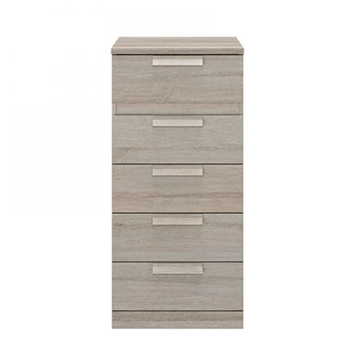 - Chiffonnier 5 tiroirs CYRUS avec le corps et façades en panneaux de particules revêtus papier imitation bois