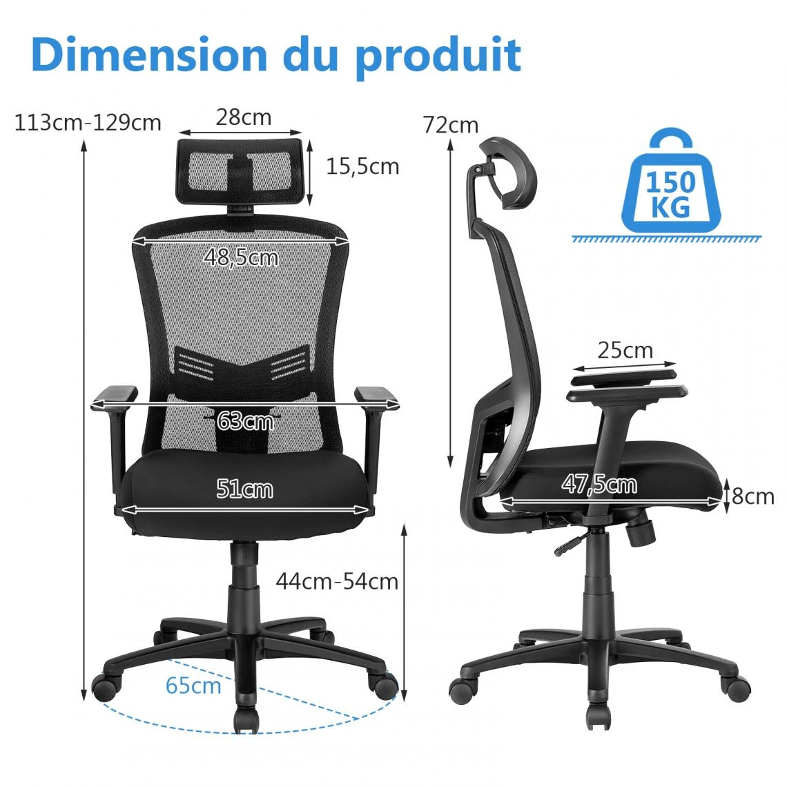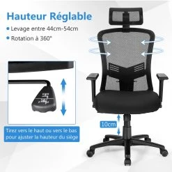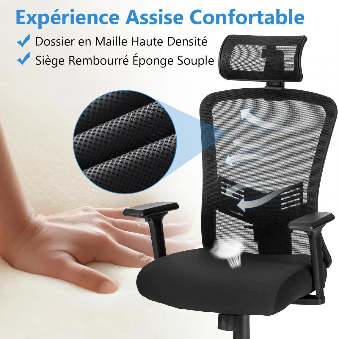 Points forts Costway Chaise de Bureau Ergonomiqueà Roulettes avec Dossier Inclinable, Support Lombaire, Appui-tête et Accoudoir Réglables, Noir