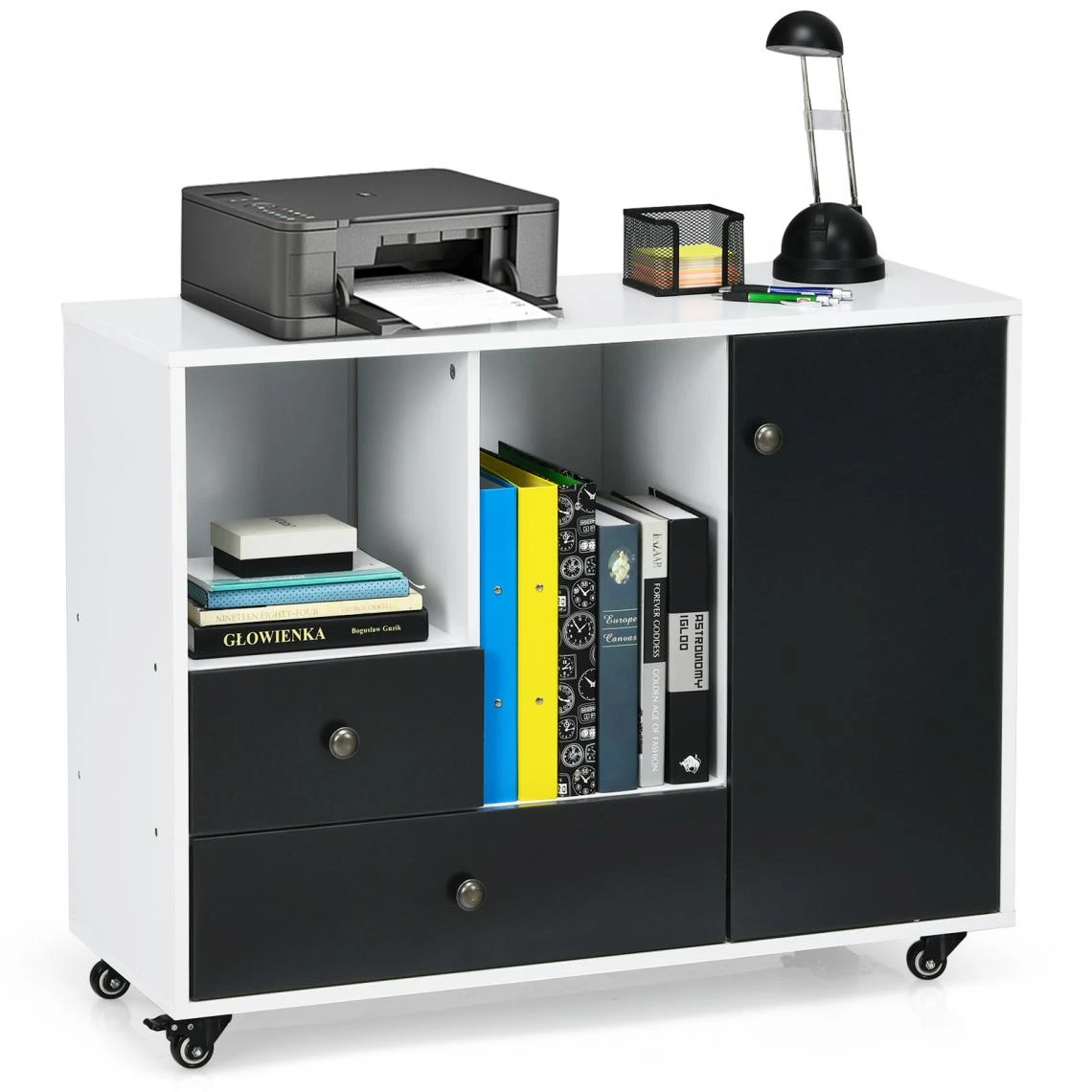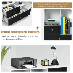 Points forts Costway Meuble pour dossiers mobile avec 2 tiroirs, 2 étagères ouvertes et 1 plateau support pour imprimante