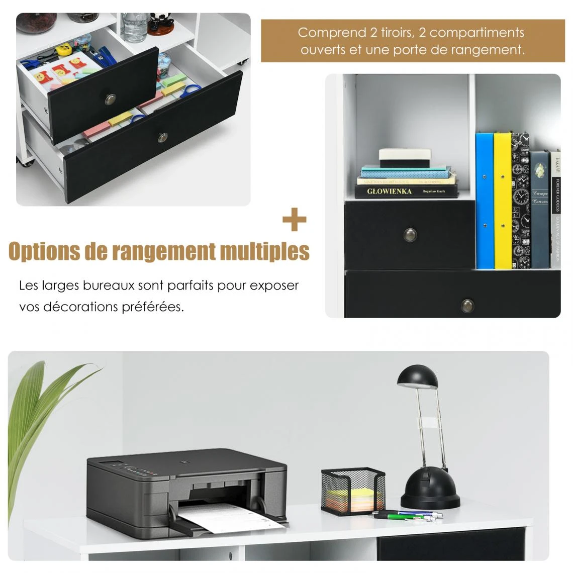 Meuble pour imprimante avec étagère intérieure repositionnable : le meuble comporte 2 tiroirs de tailles différentes, 2 compartiments ouverts de hauteurs différentes et un grand plateau, pratique pour un rangement organisé. L’étagère intérieure est repositionnable sur trois niveaux, ce qui vous permet de l’adapter en fonction de vos besoins.