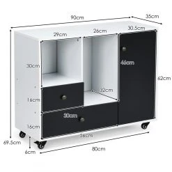 Le meuble offre de nombreux espaces de rangement et d’exposition : 2 étagères ouvertes, 2 casiers réglables discrets, 2 tiroirs et un plateau large. 4 roulettes en acier en font un meuble pratique à déplacer tout en renforçant la stabilité grâce à des dispositifs de freinage. Il peut supporter une charge de 85 kg, pour accueillir des dossiers dans un bureau, servir de buffet de cuisine, de buffet de rangement, etc. Par ailleurs, le meuble nécessite un assemblage manuel et peu d’entretien.