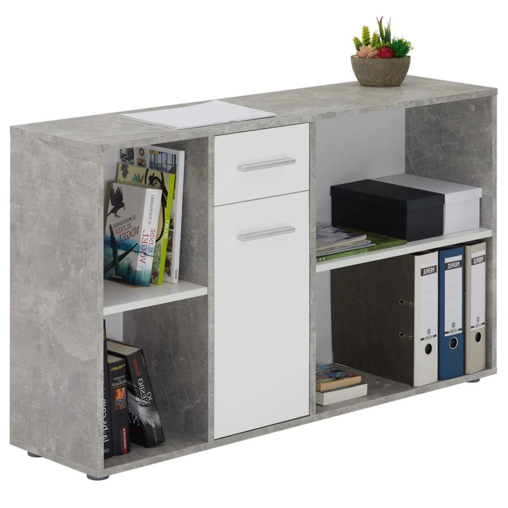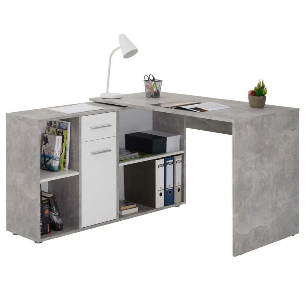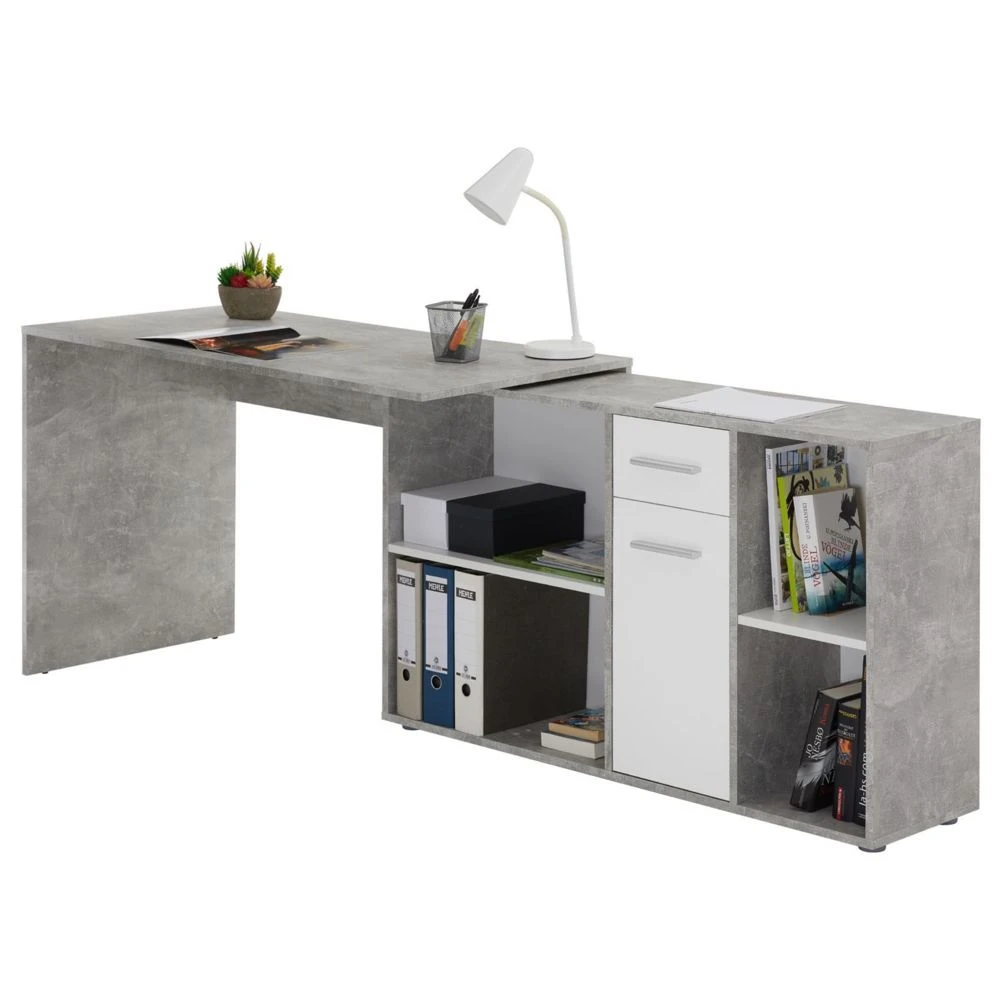 Points forts Idimex Bureau d’angle CARMEN avec meuble de rangement, décor béton et blanc mat