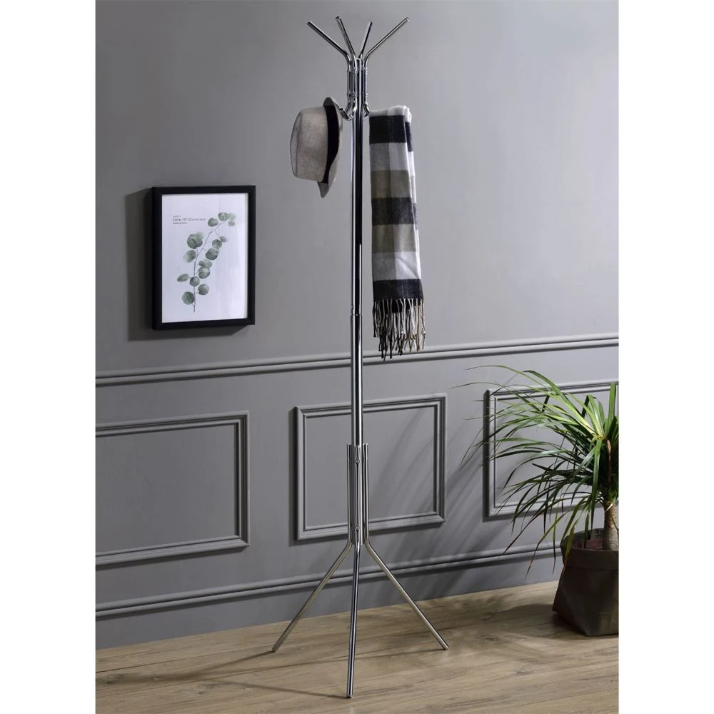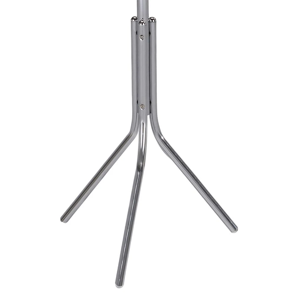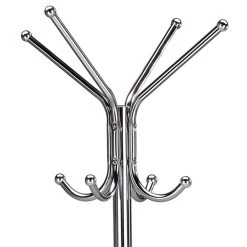 – Le porte-manteau sur pied est composé de tubes en métal chromé.