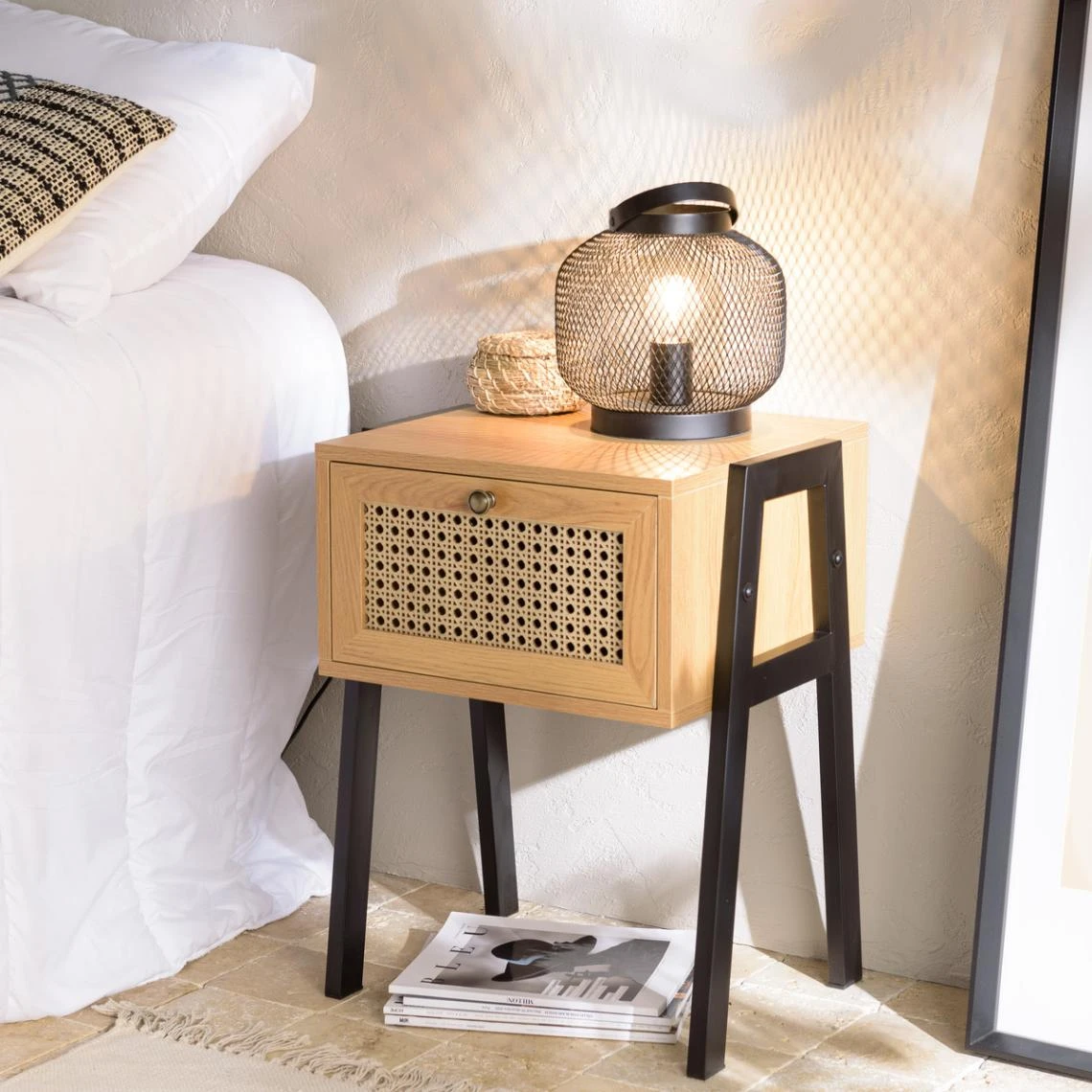 Optez pour ce Chevet marron 1 tiroir effet cannage pieds inclinés métal CHARLIE pour embellir votre chambre. Avec ses teintes naturelles et noires, il apporte une touche nordique chic dans votre intérieur. Très stable, il possède des pieds inclinés robustes en métal.
