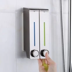 Distributeur de savon double mural pour salle de bain, cuisine, hĂ´tel, bar et restaurant.