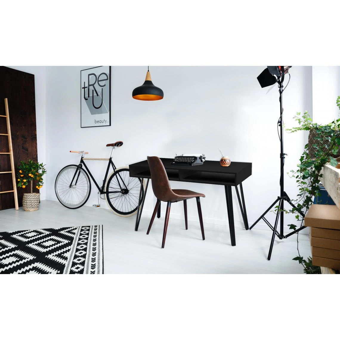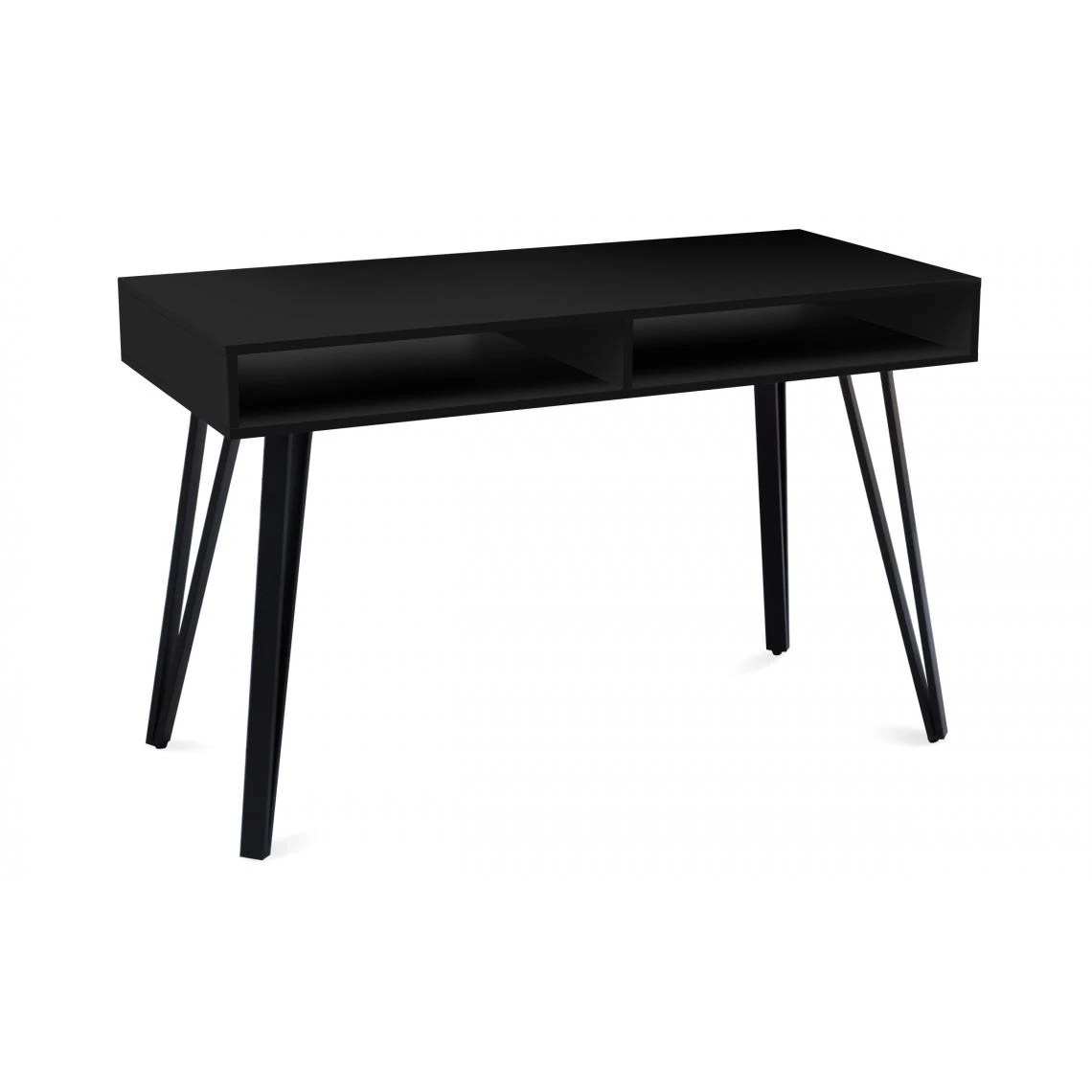 Le bureau RIVIERA est un meuble pratique muni de 2 grandes niches de rangement. Toute la partie supĂ©rieure du bureau est en bois revĂŞtu d’un film hydrofuge et rĂ©sistant noir mat tandis que ses pieds sont en mĂ©tal. Une combinaison de matĂ©riaux très tendance pour ce bureau rĂ©solument moderne. Apportez une touche de chic Ă votre intĂ©rieur avec ce meuble pratique et contemporain. // L120 x P55 x H76
