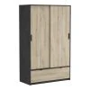 Matière : bois de palissandre massif (structure) et acier (tiroirs gris et noir, piètement)