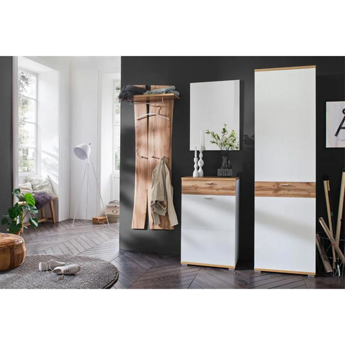 Commode élégante pour votre garde-robe avec une porte, un tiroir avec et 3 étagères réglables. La combinaison de couleurs blanc et chêne Wotan confère à la commode à chaussures un design moderne et naturel. L’espace de rangement peut accueillir jusqu’à 8 paires de chaussures et les planchers ont une capacité de charge maximale de 10 kg.