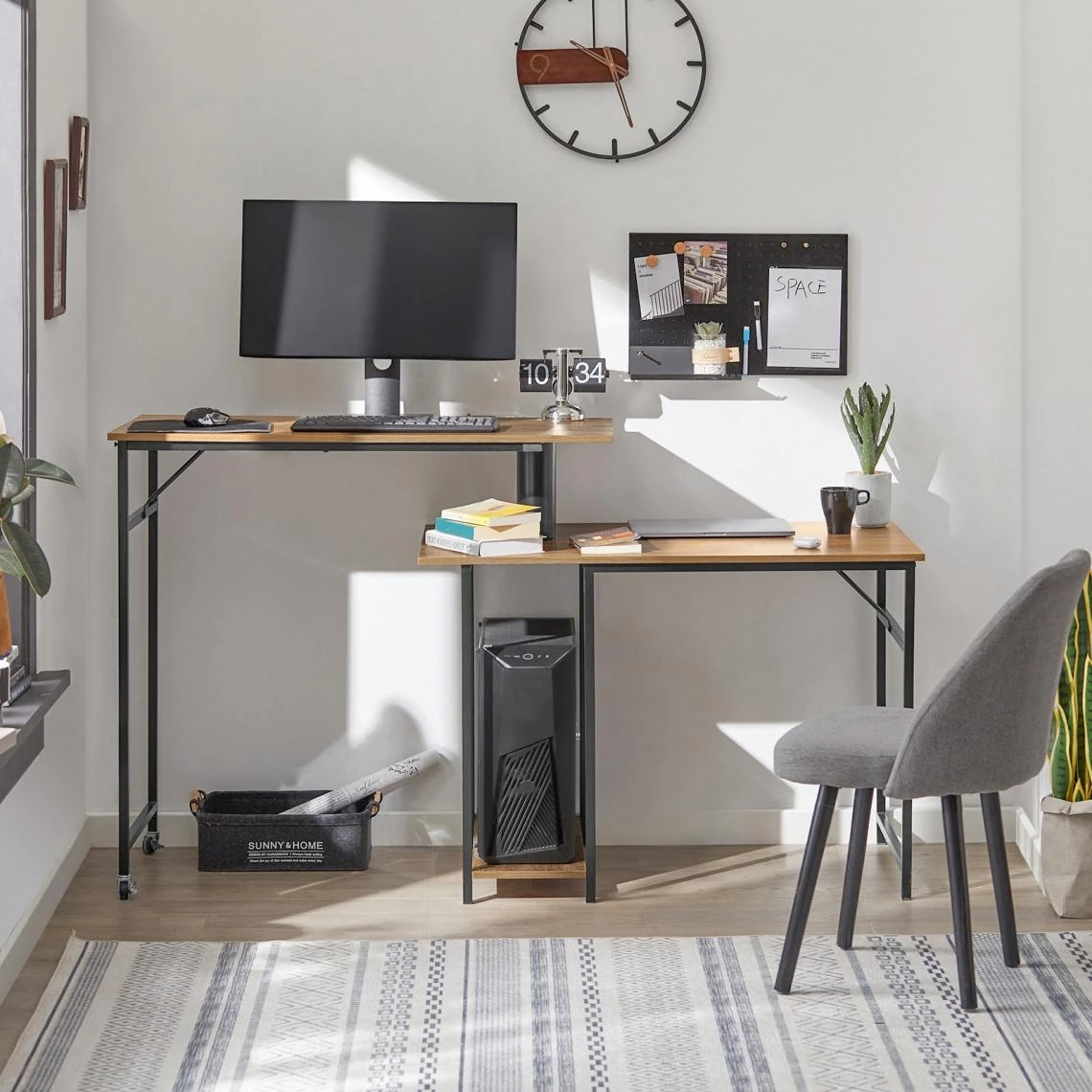 - Grâce aux plateaux de table à deux hauteurs, vous pouvez choisir de travailler debout ou assis. 2 étagères latérales vous permettant de ranger convenablement matériel informatique, livres, décorations, etc…