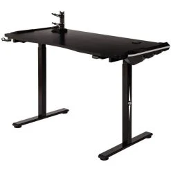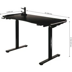 Bureau gaming réglable en hauteur – Cadre en acier – Panneau de particules avec surface de film texturé en fibre de carbone – L’utilisateur peut passer de la position assise a debout – Support de contrôleur – Éclairage RVB – Crochet pour casque.