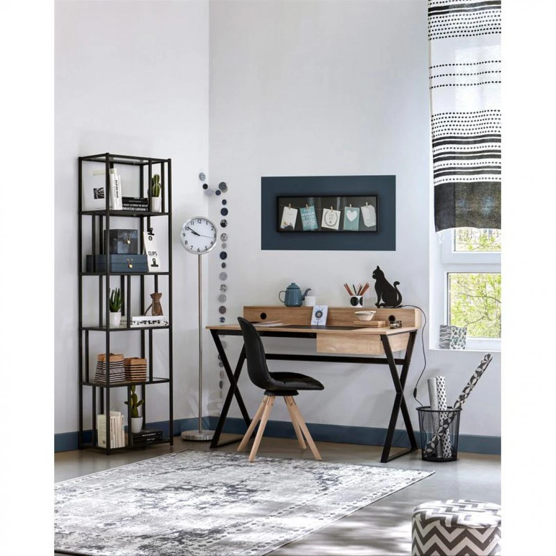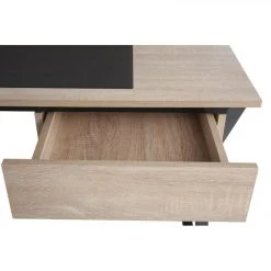 Ce bureau bicolore chêne et noir est idéal dans une décoration industrielle. Vous pourrez facilement assortir ses montants en métal époxy noir avec d’autres meubles dans le même style. N’oubliez pas d’ajouter une chaise scandinave ou rustique pour vous assoir confortablement à votre nouveau bureau.