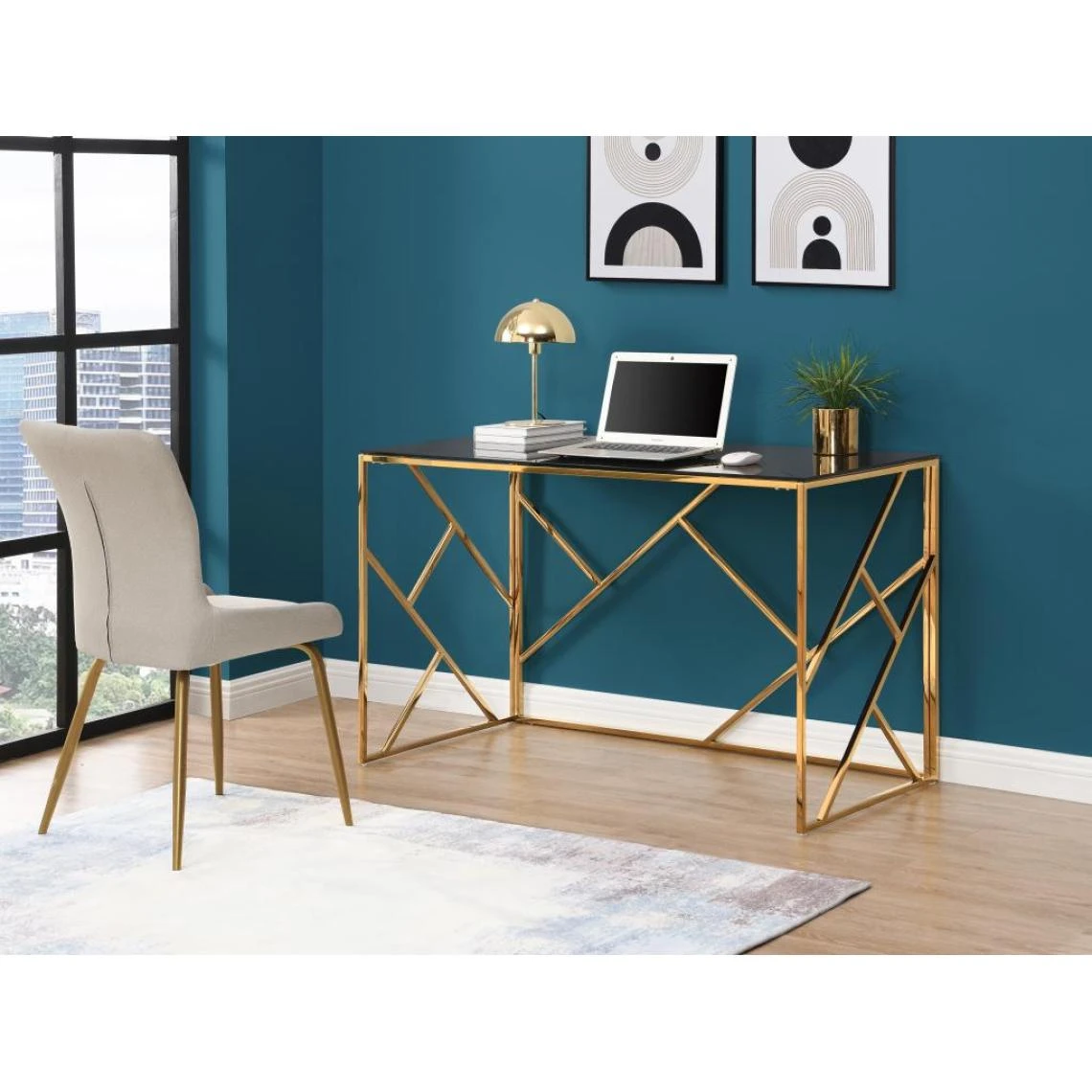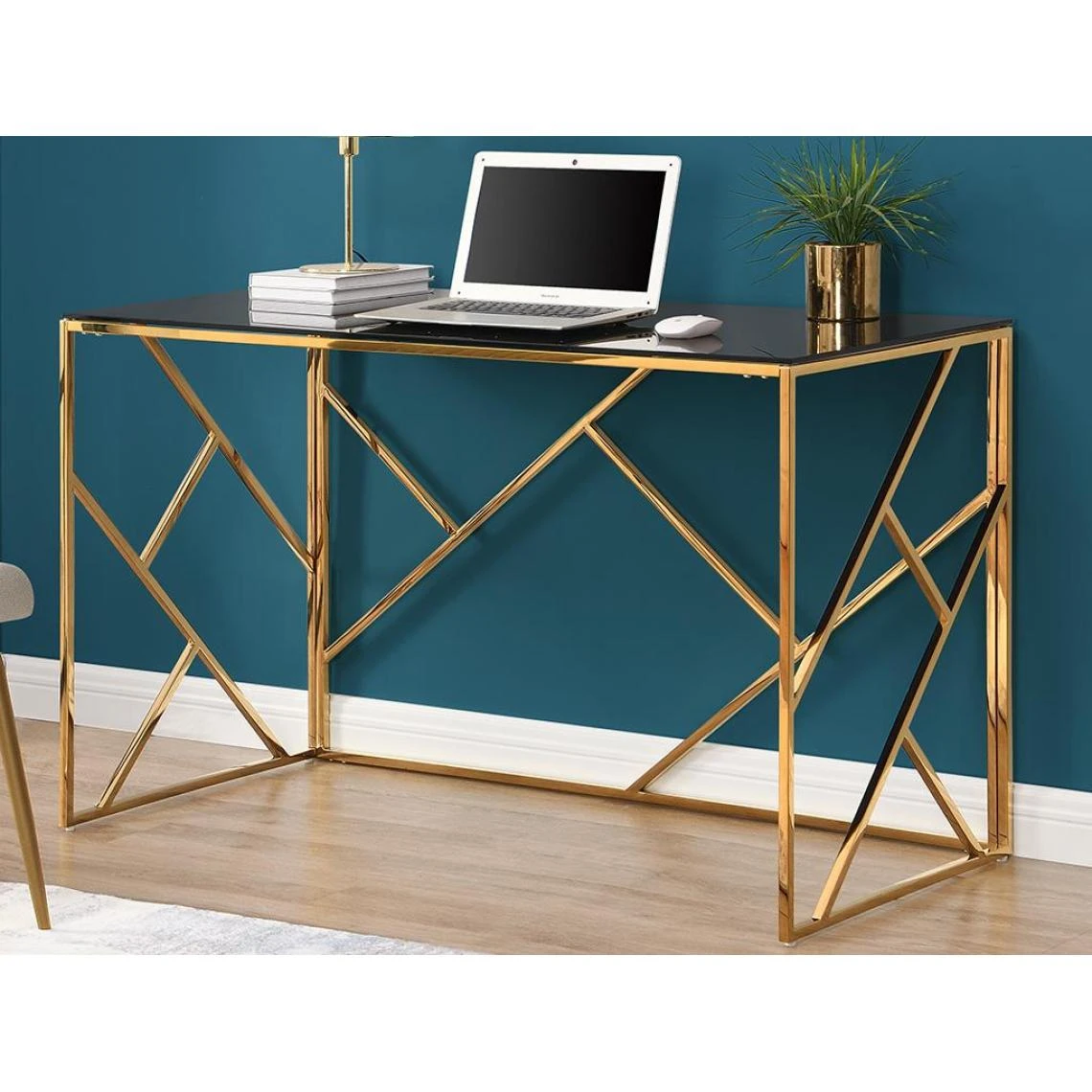Points forts Vente-Unique Bureau en verre trempé et acier – Doré et noir – ATHENA