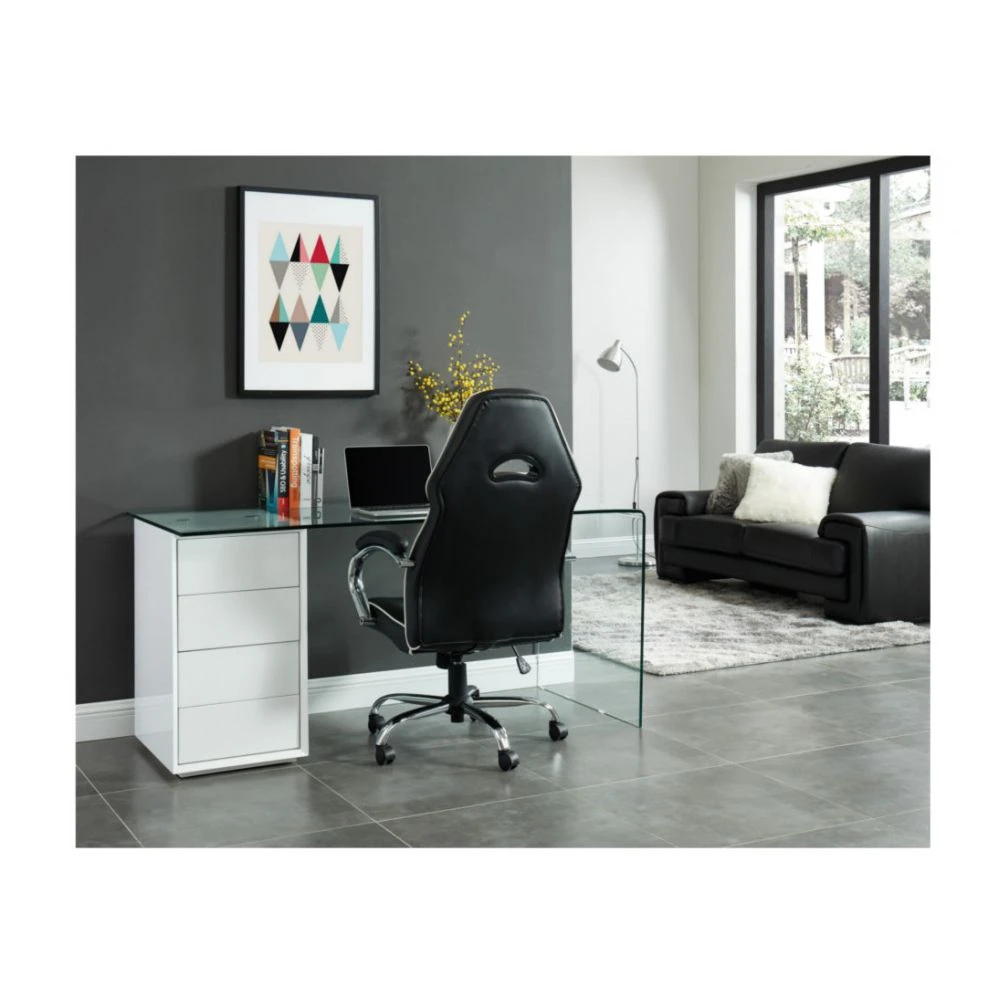 Avec son plateau en verre trempé de 160cm, le bureau MURIEL allie praticité et design pour devenir la pièce maîtresse de votre espace bureau. Ses 4 tiroirs en MDF octroieront un espace de rangement propice à votre organisation de travail.