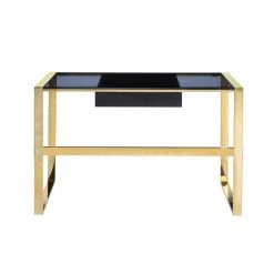Le bureau SALI apportera un style art déco inégalable à votre espace de travail ! Son plateau en verre trempé noir à la finition transparente est soutenu par des pieds en acier inoxydable doré.