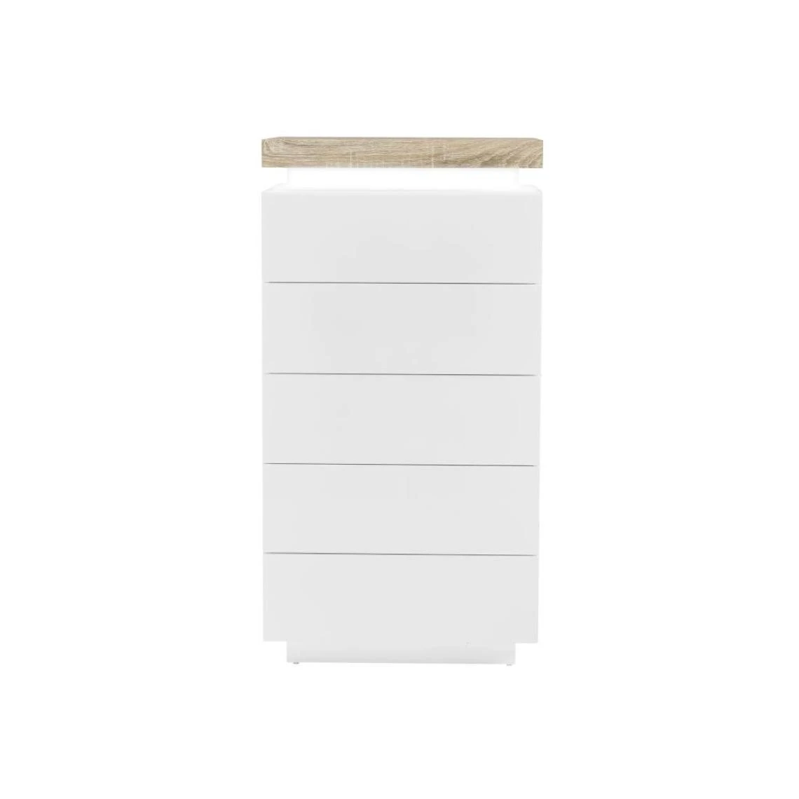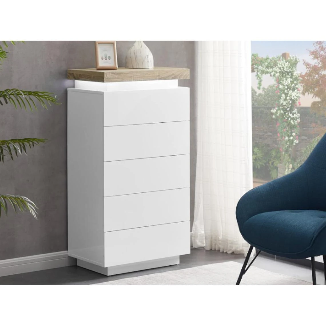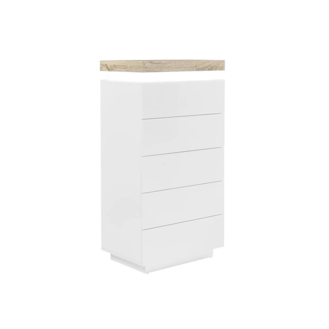 Points forts Vente-Unique Chiffonnier 5 tiroirs – Avec LEDs – MDF laquĂ© – Blanc et naturel – HALO