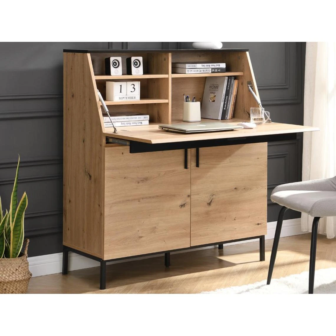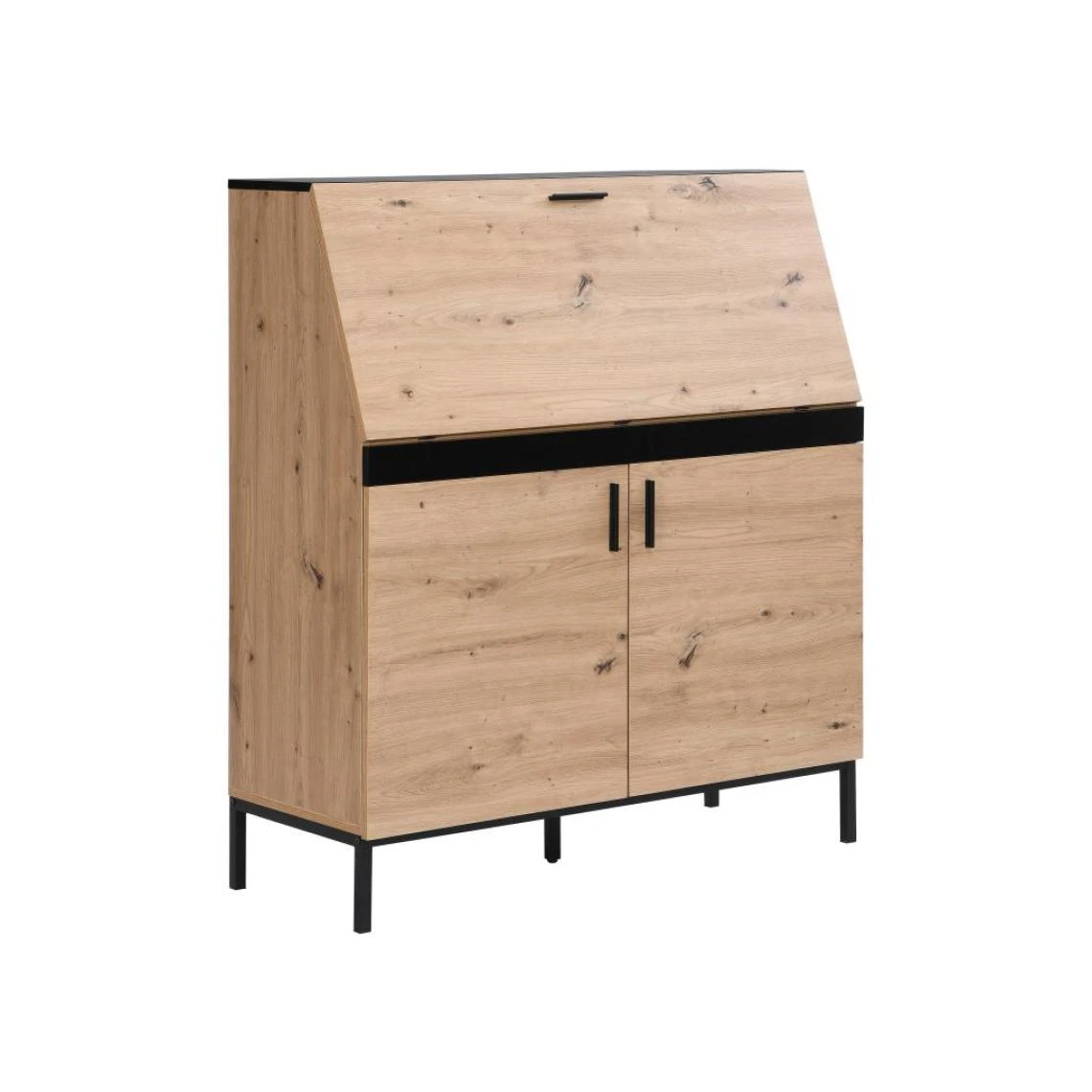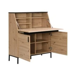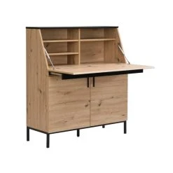 Avec son association de coloris naturel et noir, le bureau secrĂ©taire MALEDA rĂ©invente l’esprit secrĂ©taire antique dans un style plus moderne et industriel. Il possède un plateau rabattable dĂ©voilant un compartiment de rangements dotĂ© de 4 niches en plus des 2 placards sur le bas du meuble.