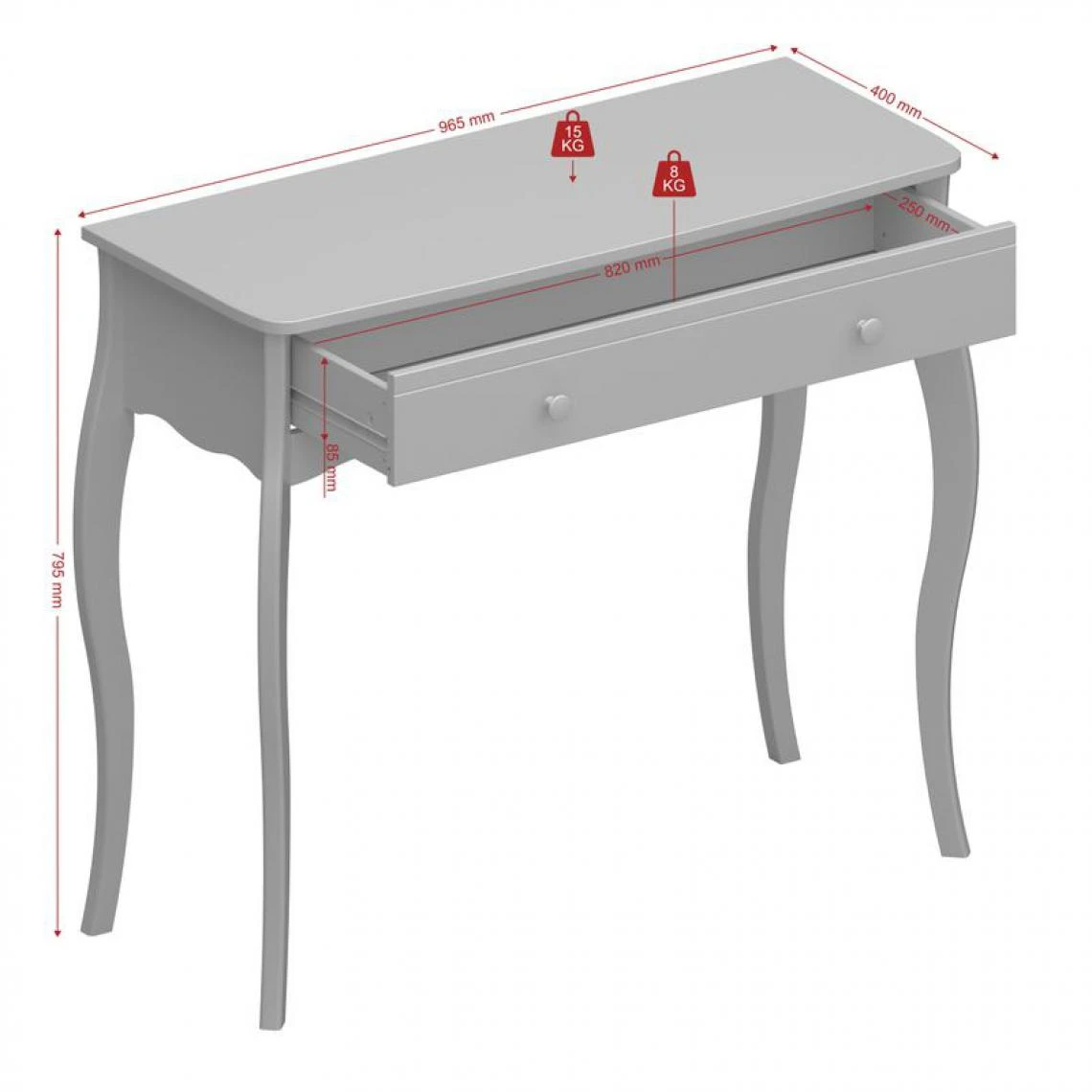 La console Barroco se montre très pratique grâce Ă son grand tiroir qui offre un espace de rangement suffisant pour y glisser vos accessoires de beautĂ© et bien plus. Fonctionnel, celui-ci possède deux poignĂ©es qui permettent de l’ouvrir facilement. Cette console de 96,5 x 79,5 x 39,9 cm est peu encombrante et peut ĂŞtre installĂ©e oĂą vous le souhaitez dans la chambre. De plus, elle dispose de pieds hauts qui offrent la possibilitĂ© de glisser un tabouret juste en dessous. Pour l’entretien, un simple coup de chiffon doux et propre suffit pour Ă´ter la poussière.